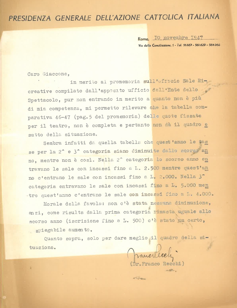 Lettera di Francesco Recchi, presidente diocesano di Roma della Gioventù di Azione cattolica, a Emilio Giaccone