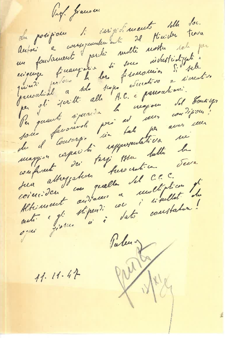 Luigi Palma scrive a Emilio Giaccone su questioni finanziarie riguardanti la gestione delle sale parrocchiali e dei rapporti con gli enti dello spettacolo. Manoscritto