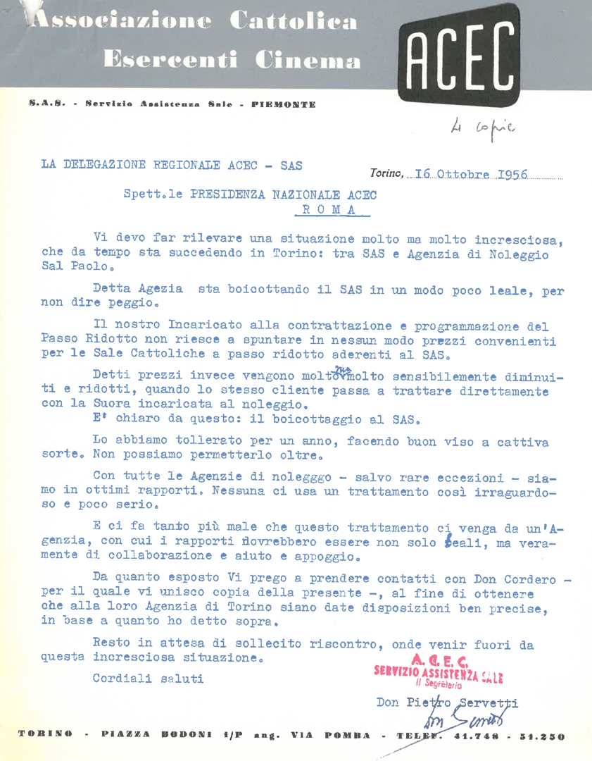 Don Pietro Servetti chiede a mons. Francesco Dalla Zuanna di intervenire nei difficili rapporti tra il Servizio assistenza sale - SAS di Torino e Agenzia di noleggio San Paolo. Dattiloscritto