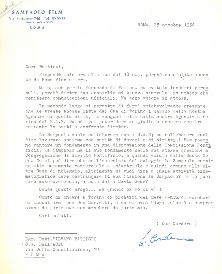 Lettera di risposta di don Emilio Cordero, direttore della San Paolo Film, a Silvano Battisti, segretario generale dell'ACEC