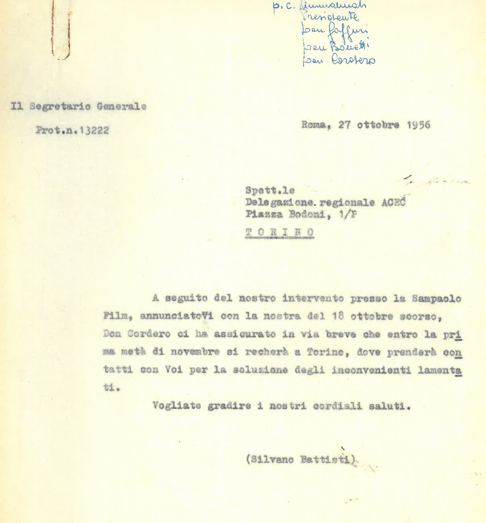 Silvano Battisti assicura a don Pietro Servetti la sollecita risoluzione degli inconvenienti sorti tra il SAS e la San Paolo Film. Dattiloscritto