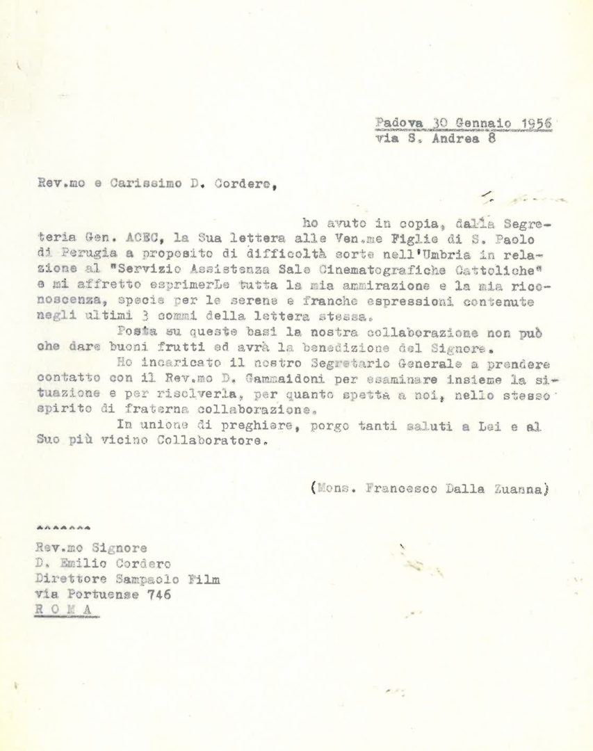 Lettera di mons. Francesco Dalla Zuanna, presidente dell'ACEC, a don Emilio Cordero, direttore della San Paolo Film