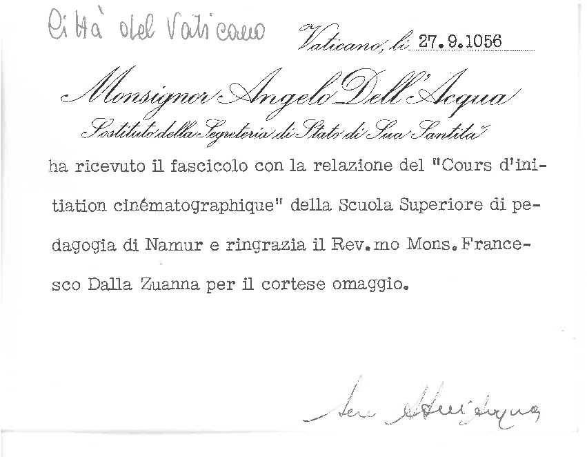 Mons. Angelo Dell'Acqua ringrazia mons. Francesco Dalla Zuanna per aver ricevuto in omaggio il fascicolo con la relazione "Cours d'initiation cinématographique" della Scuola superiore di pedagogia di Namur. Dattiloscritto