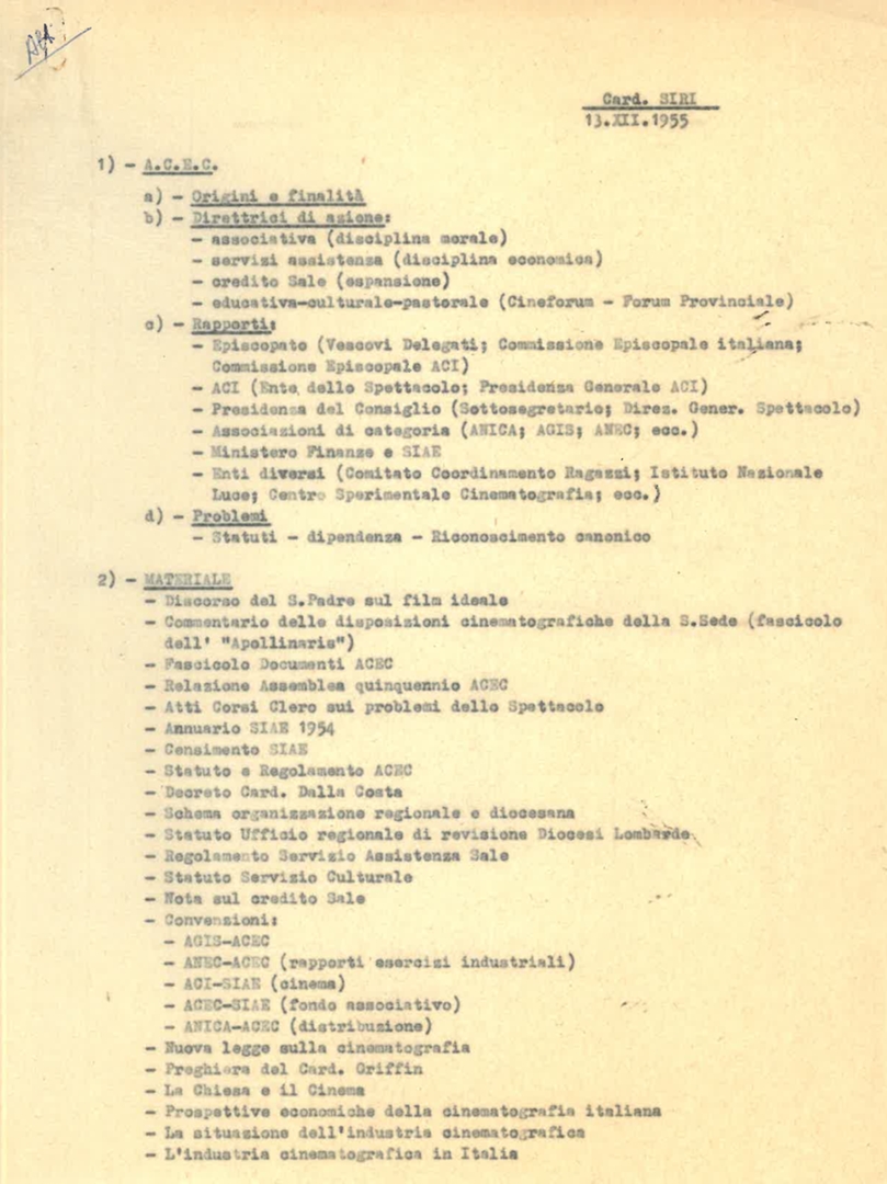 Prospetto a cura del cardinale Giuseppe Siri. Dattiloscritto