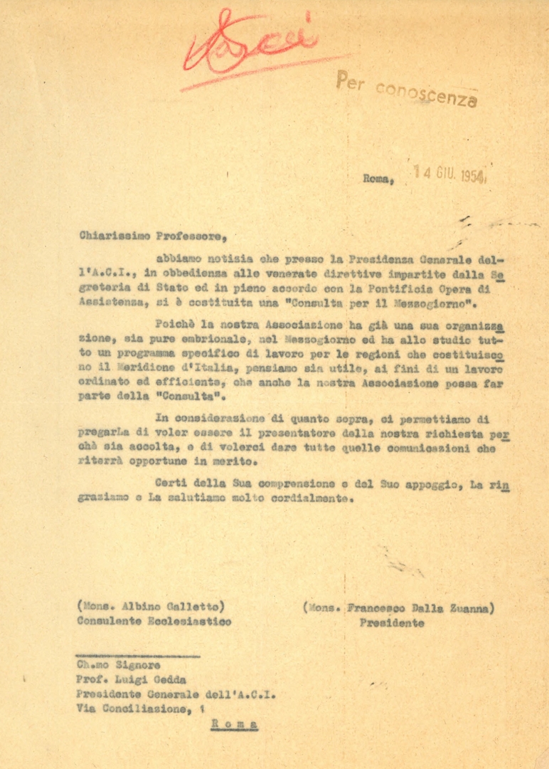 Mons. Francesco Dalla Zuanna e mons. Albino Galletto scrivono al prof. Luigi Gedda per chiedere che l'Associazione possa far parte della nuova Consulta per il mezzogiorno. Dattiloscritto