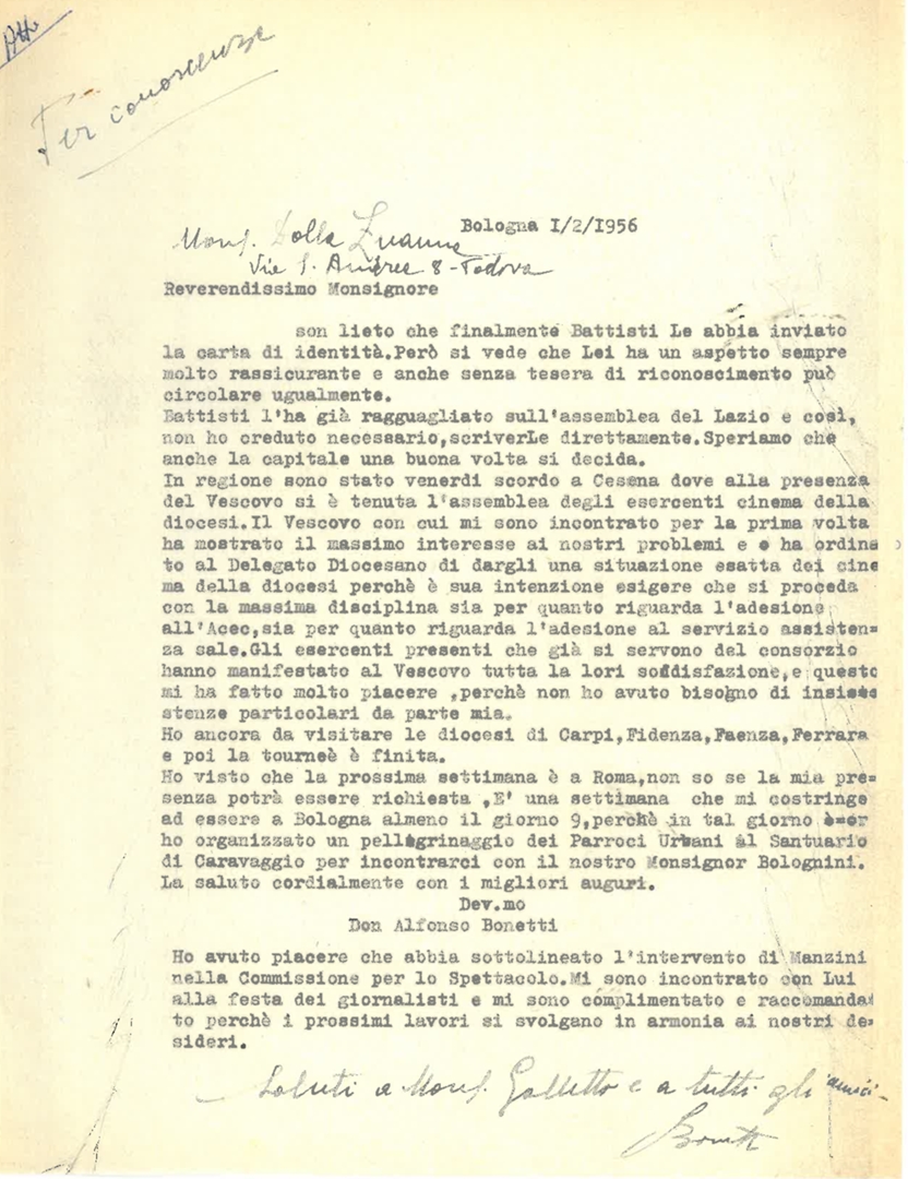 Don Alfonso Bonetti aggiorna mons. Francesco Dalla Zuanna sulle attività degli esercenti cinema della diocesi di Bologna. Dattiloscritto