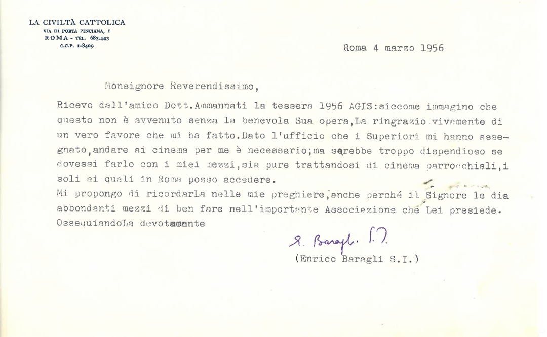 Lettera di Enrico Baragli, pubblicista della Civiltà Cattolica, a mons. Francesco Dalla Zuanna, presidente dell'ACEC