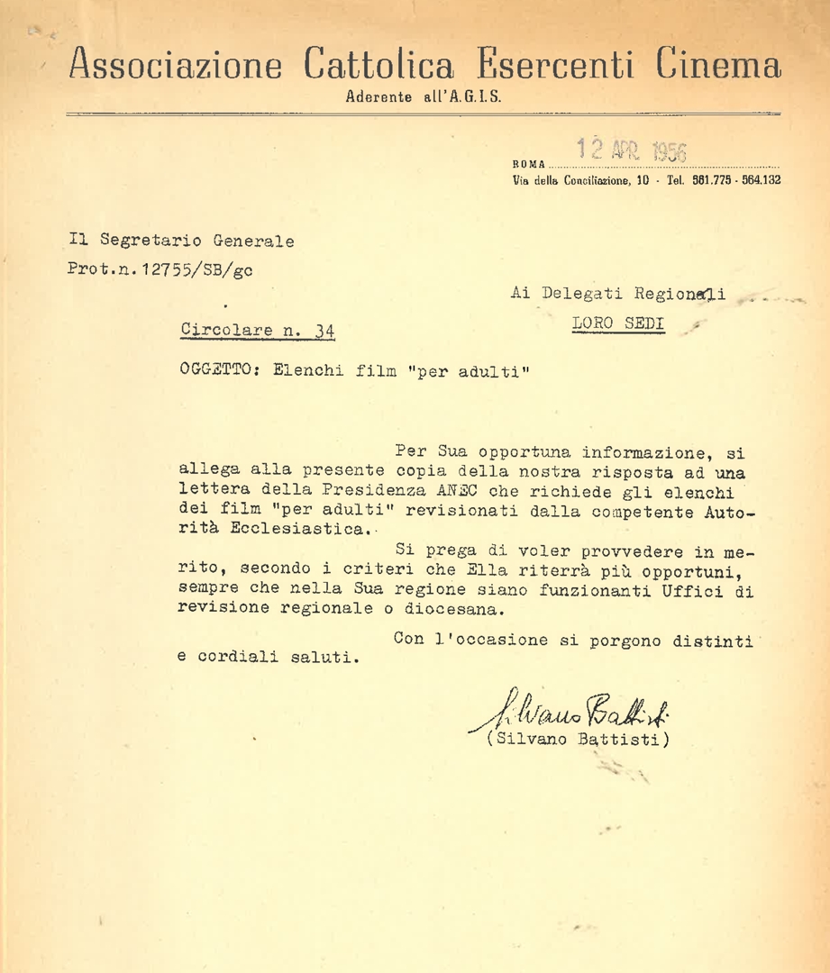 Silvano Battisti chiede ai delegati regionali ACEC di provvedere alla revisione dei film per adulti. Dattiloscritto