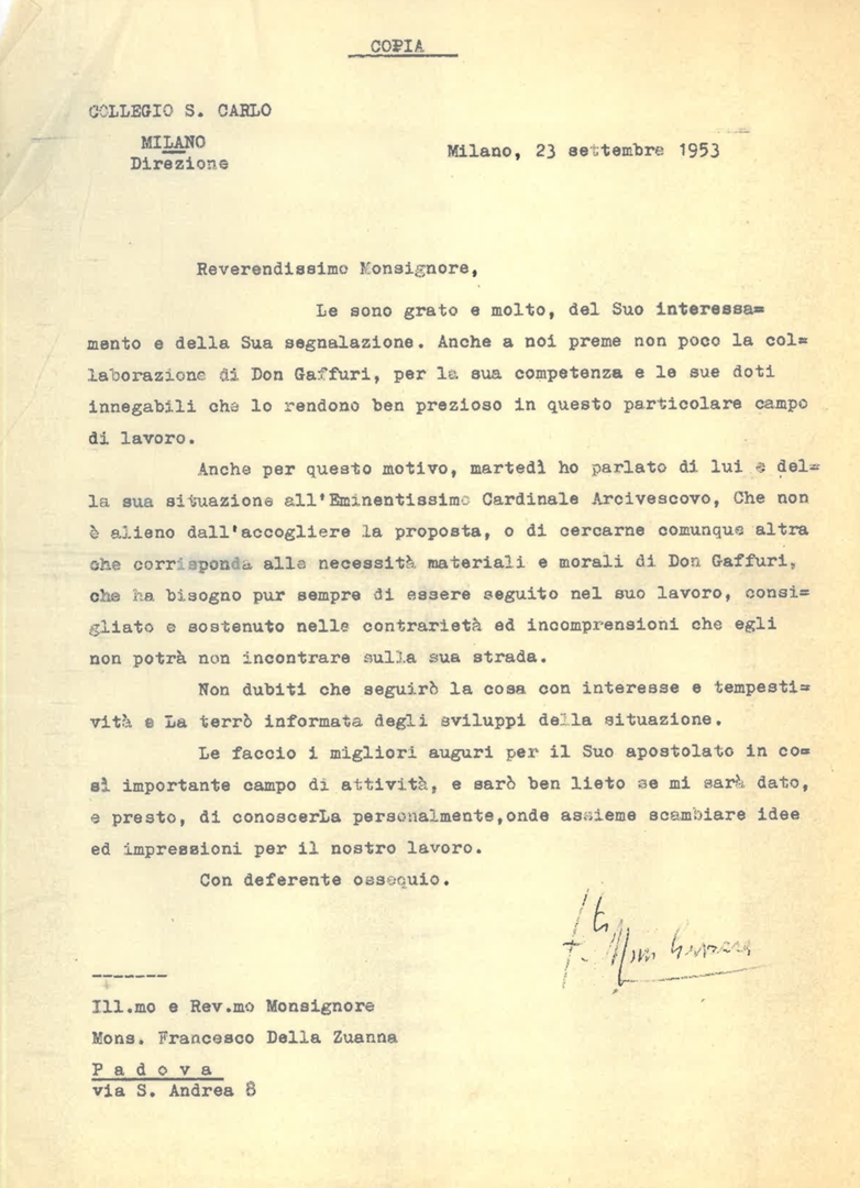 Lettera di mons. Ludovico Gianazza, direttore del collegio S. Carlo di Milano, a mons. Francesco Dalla Zuanna, presidente dell'ACEC