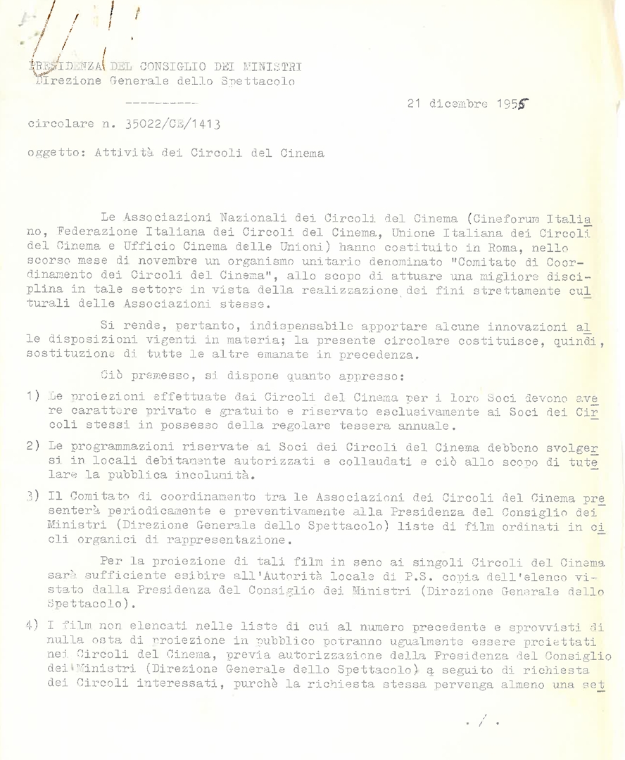 Disposizioni per l'attività dei circoli del cinema. Dattiloscritto