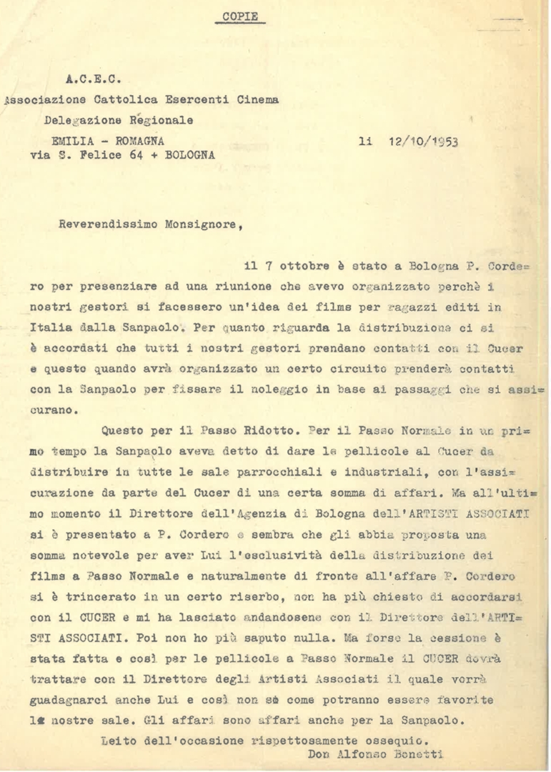 Don Alfonso Bonetti scrive a mons. Francesco Dalla Zuanna in merito al noleggio di film editi dalla San Paolo e alla distribuzione delle pellicole a passo ridotto e a passo normale. Dattiloscritto
