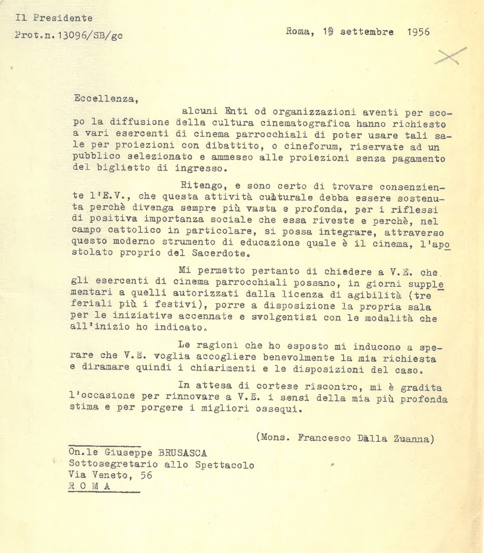 Mons. Francesco dalla Zuanna chiede all'on. Giuseppe Brusasca l'autorizzazione per gli esercenti dei cinema parrocchiali ad effettuare proiezioni nei giorni di chiusura stabiliti per legge. Dattiloscritto