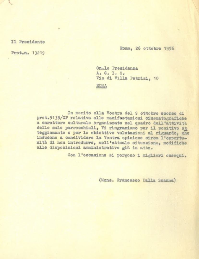 Lettera di risposta di mons. Francesco Dalla Zuanna, presidente dell'ACEC, a Italo Gemini, presidente dell'Associazione Generale Italiana dello Spettacolo - AGIS