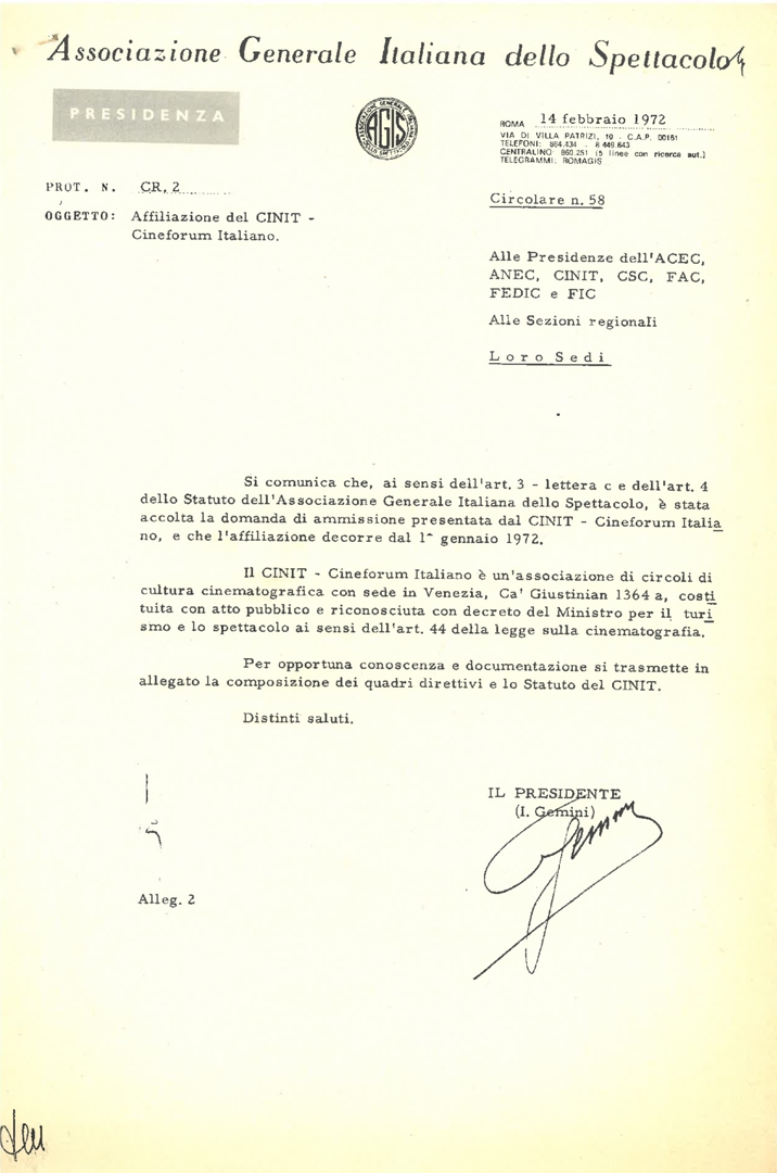 Ammissione del CINIT all'AGIS. Con lettera di Italo Gemini, presidente dell'Associazione Generale Italiana dello Spettacolo - AGIS, alle presidenze dell'ACEC, ANEC, CINIT, CSC, FAC, FEDIC, FIC e alle sezioni regionali
