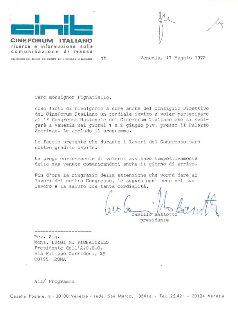 Camillo Bassotto invita mons. Luigi Pignatiello a partecipare al 1° congresso nazionale del cineforum italiano in programma a Venezia nei giorni 1 e 2 giugno 1972. Dattiloscritto