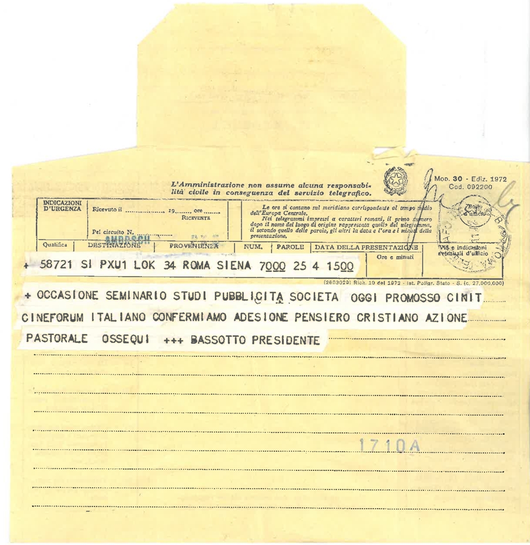 Telegramma di Camillo Bassotto, presidente di CINIT - CINEFORUM ITALIANO, a mons. Luigi Pignatiello, presidente dell'ACEC