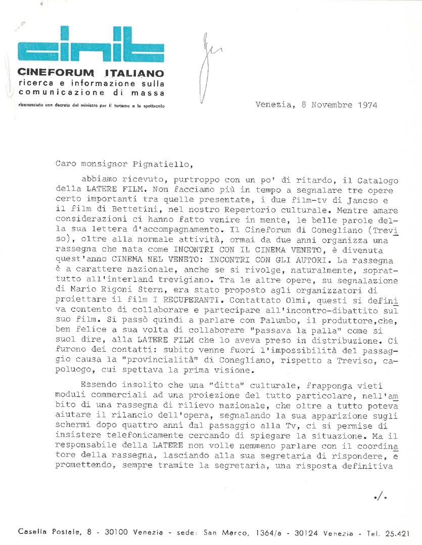 Lettera di Camillo Bassotto, presidente di Cineforum italiano - CINIT, a mons. Luigi Pignatiello, presidente dell'ACEC