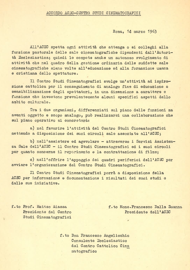 Testo a firma del prof. Matteo Ajassa, presidente del Centro studi cinematografici, di mons. Francesco Dalla Zuanna, presidente dell'ACEC e di don Francesco Angelicchio, consulente ecclesiastico del Centro cattolico cinematografico. Dattiloscritto