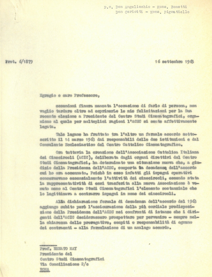 Lettera di mons. Francesco Dalla Zuanna, presidente dell'ACEC, a Renato May, presidente del Centro studi cinematografici - CSC