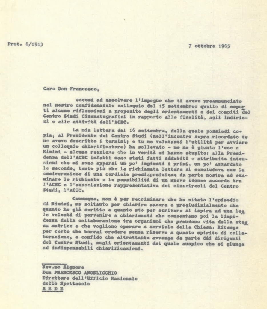 Lettera di mons. Francesco Dalla Zuanna, presidente dell'ACEC, a don Francesco Angelicchio, direttore dell'Ufficio nazionale dello spettacolo