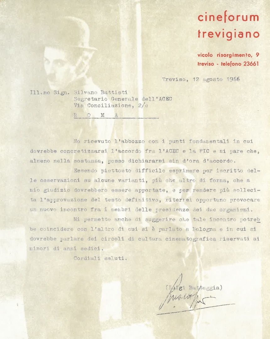 Luigi Battaggia risponde a Silvano Battisti suggerendo un incontro per l'esame della bozza di accordo ACEC - Federazione Italiana Cineforum - FIC. Dattiloscritto
