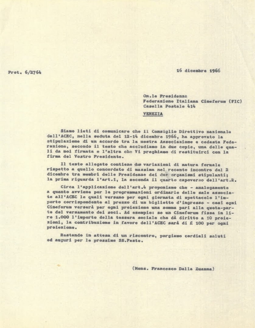Con lettera di trasmissione di mons. Francesco Dalla Zuanna, presidente dell'ACEC, alla Presidenza della FIC. Dattiloscritto