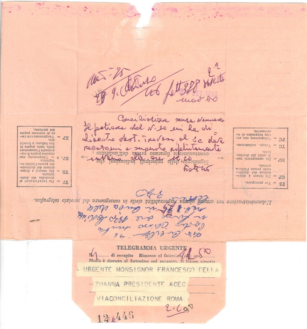 Telegramma della Federazione Italiana Cineforum - FIC a mons. Francesco Dalla Zuanna, presidente dell'ACEC