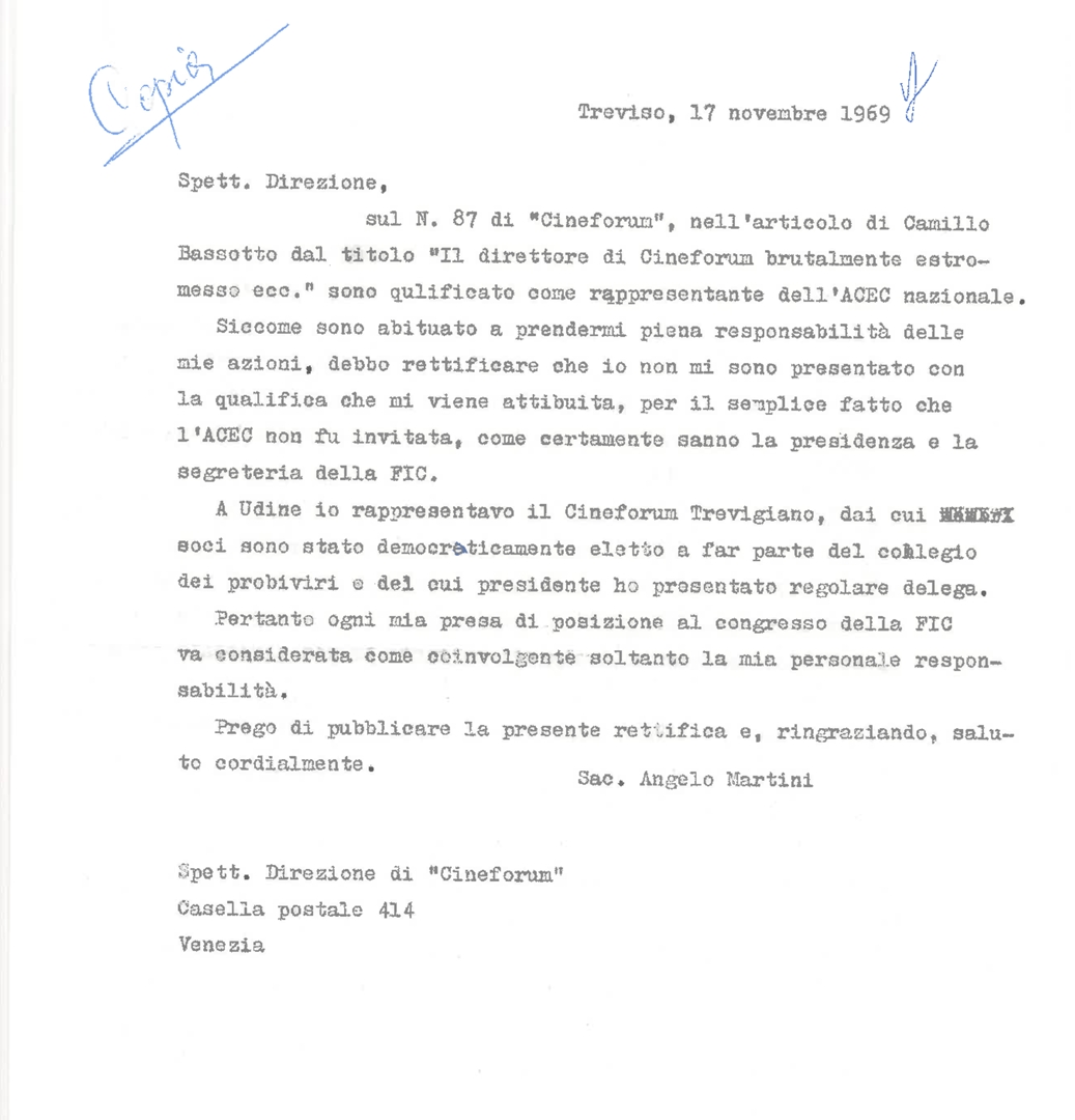 Lettera di don Angelo Martini del Cineforum di Treviso alla direzione di "Cineforum"