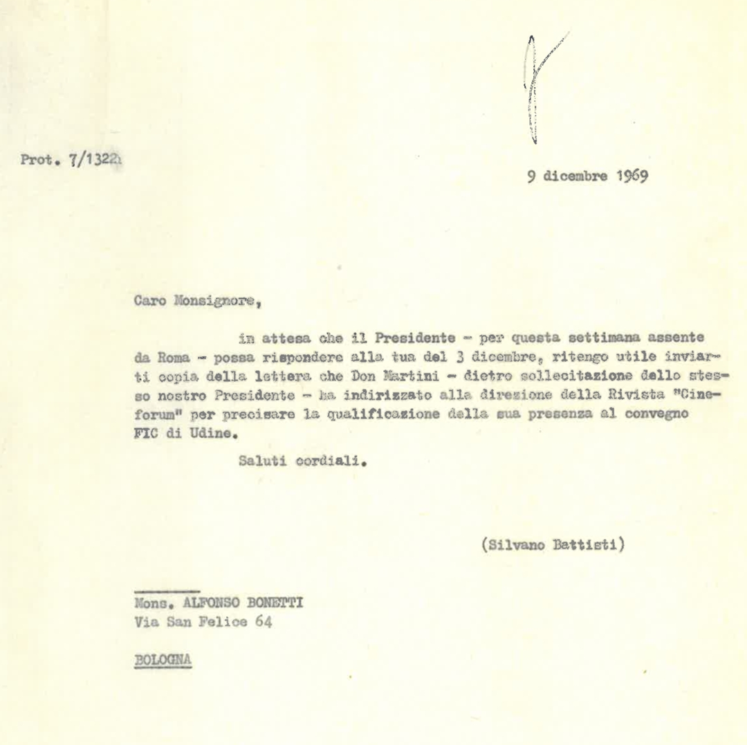 Silvano Battisti scrive a mons. Alfonso Bonetti in merito alla qualificazione della sua presenza al congresso FIC di Udine. Dattiloscritto