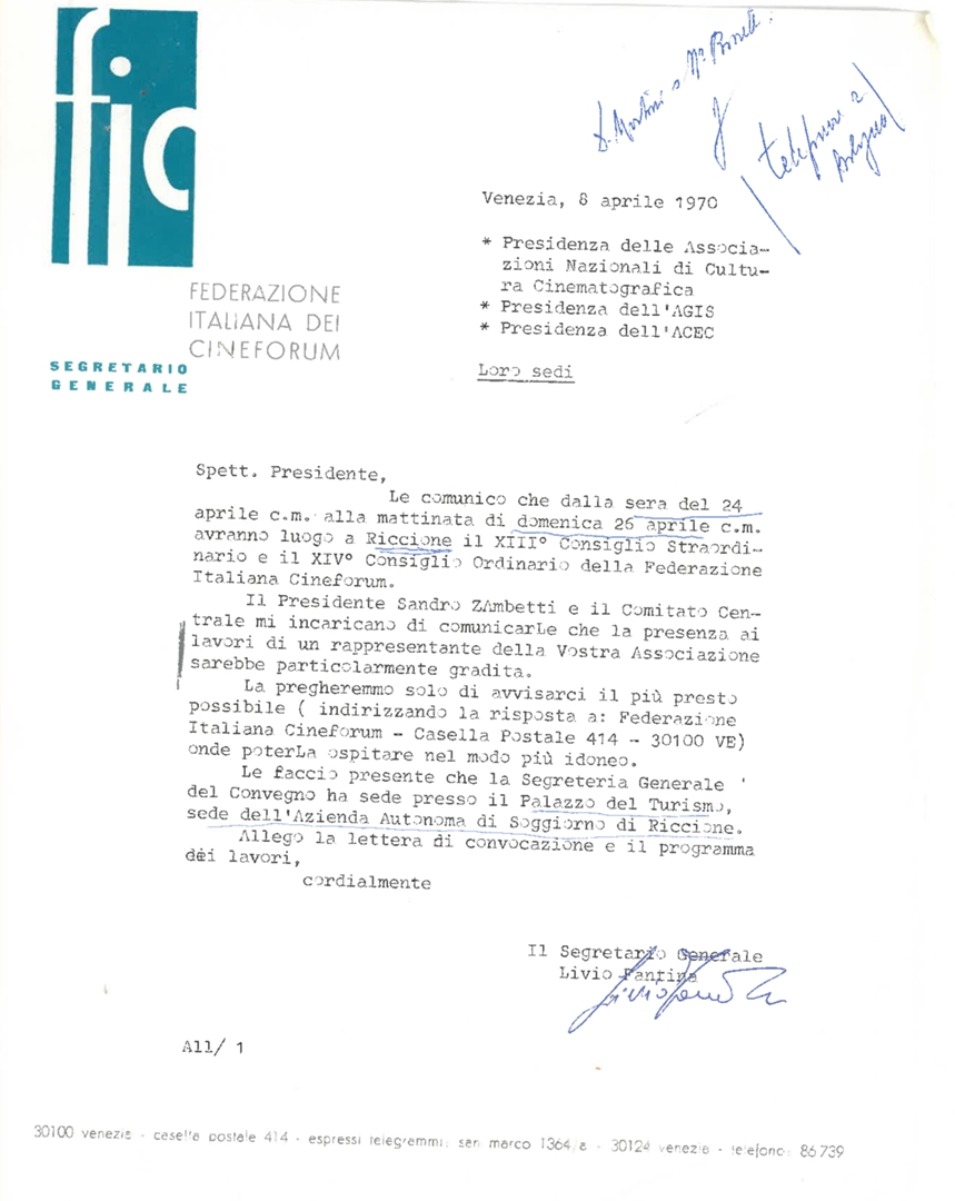 XIII° Consiglio straordinario e XIV° Consiglio ordinario della Federazione Italiana Cineforum - FIC, Riccione 25-26 aprile 1970. Programma e lettera di convocazione del presidente Sandro Zambetti