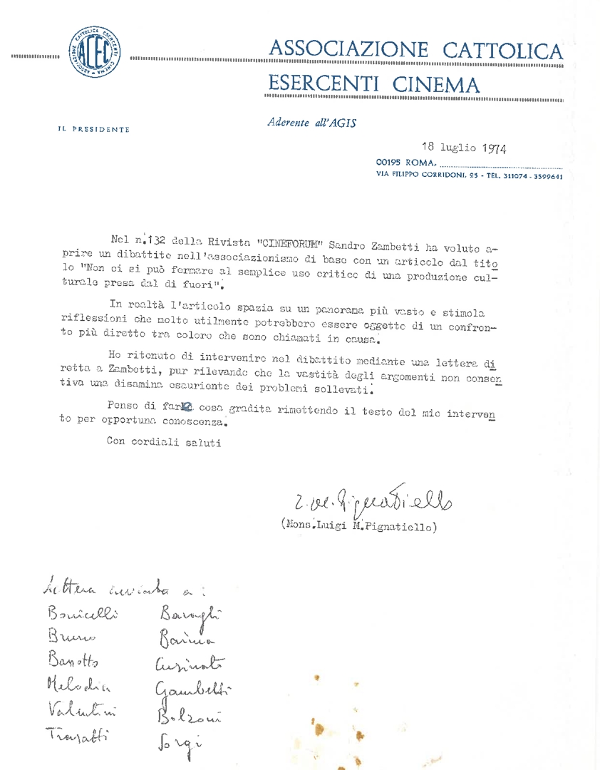 Mons. Luigi Pignatiello trasmette il testo della lettera da lui inviata a Sandro Zambetti, presidente della Federazione Italiana Cineforum - FIC, in merito al dibattito aperto dalla rivista "Cineforum". Dattiloscritto