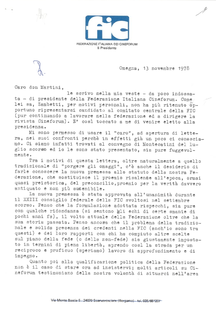 Lettera di Bruno Fornara, presidente della Federazione Italiana Cineforum - FIC, a don Angelo Martini, presidente dell'ACEC