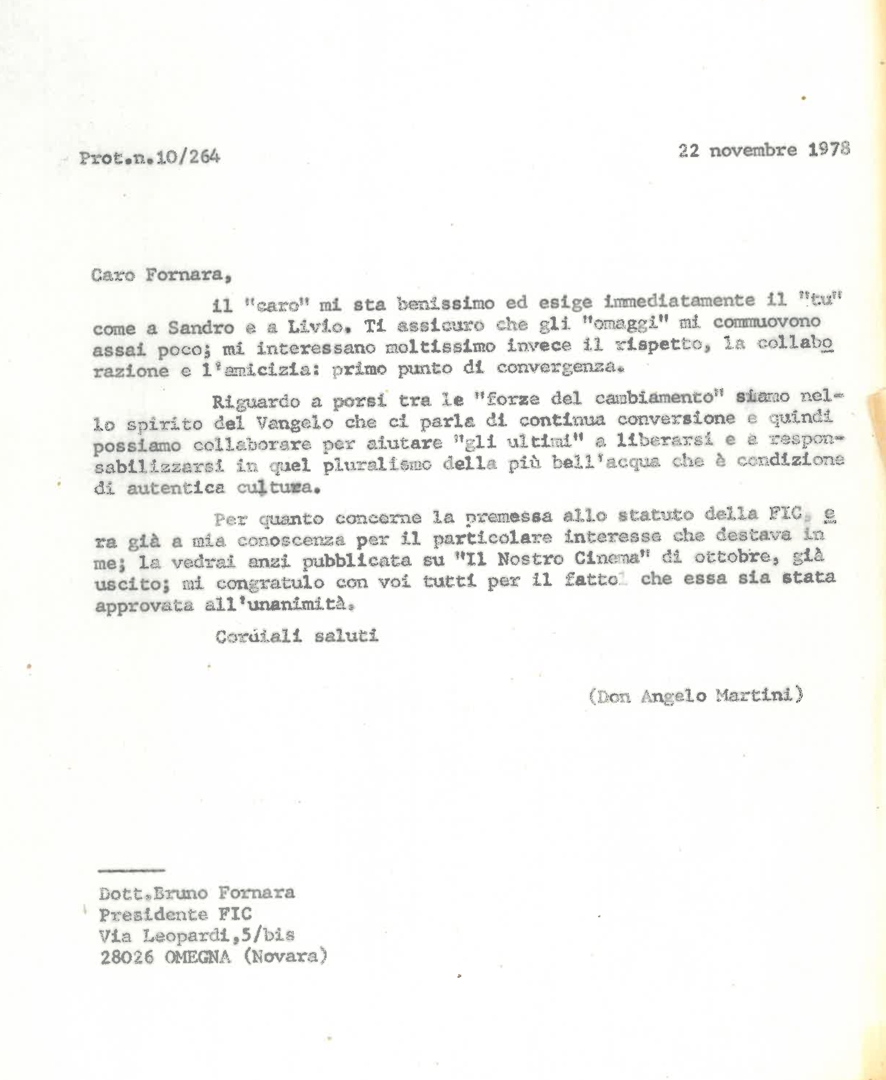 Lettera di don Angelo Martini, presidente dell'ACEC, a Bruno Fornara, presidente della Federazione Italiana Cineforum - FIC