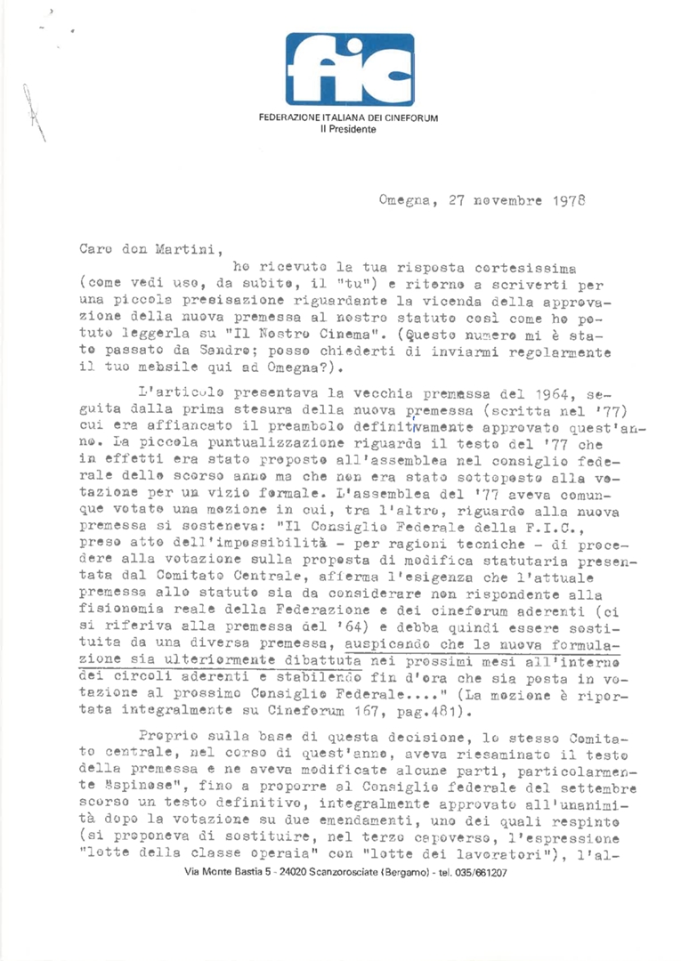 Lettera di Bruno Fornara, presidente della Federazione Italiana Cineforum - FIC, a don Angelo Martini, presidente dell'ACEC