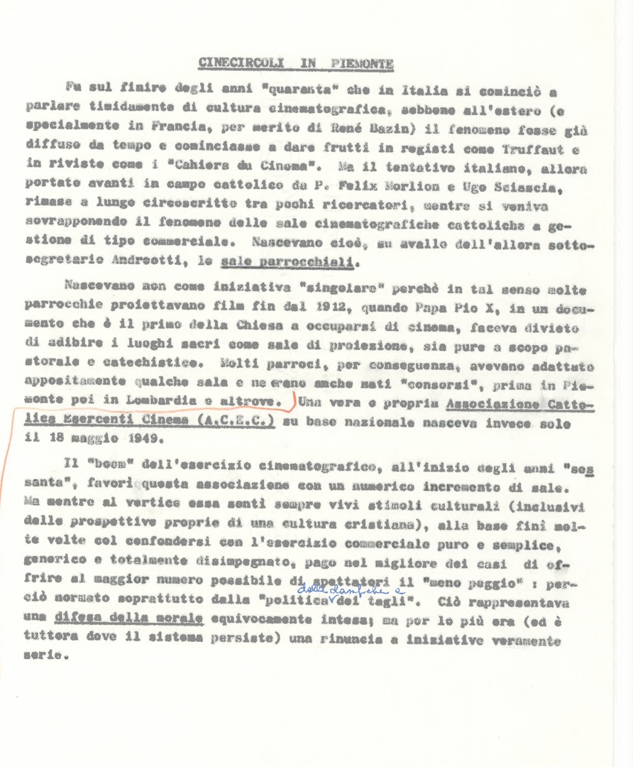 Relazione sulla nascita delle sale parrocchiali e dell'esercizio cinematografico cattolico, a cura di Angelo Schwarz. Dattiloscritto