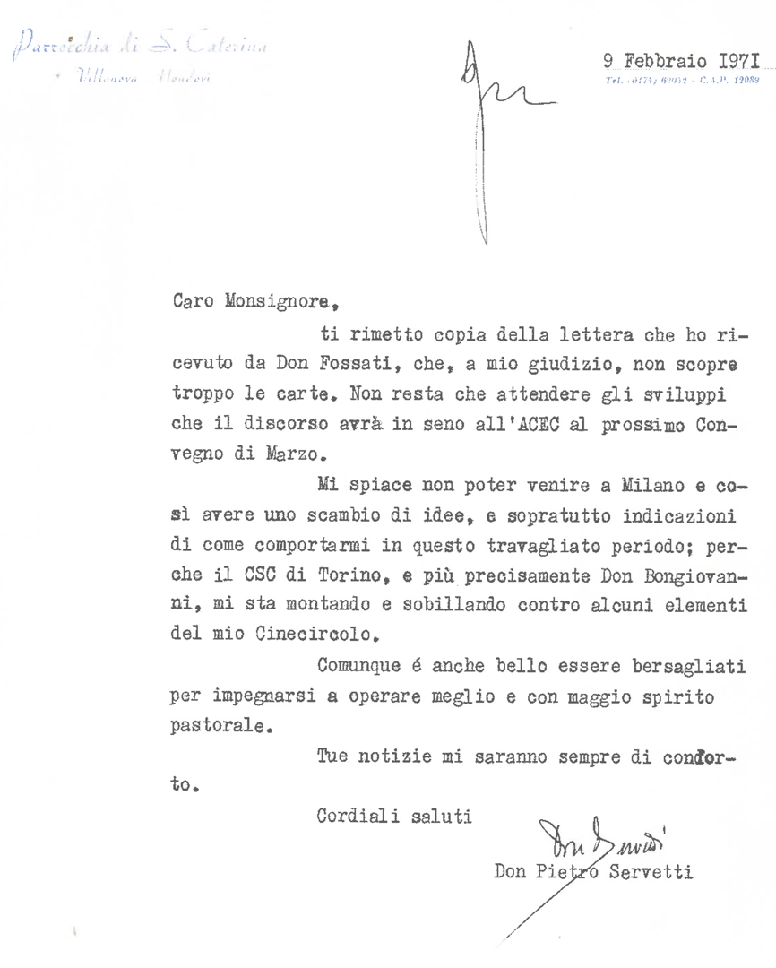 Lettera di don Pietro Servetti della parrocchia di Santa Caterina di Villanova Mondovì a mons. Luigi Pignatiello, presidente dell'ACEC