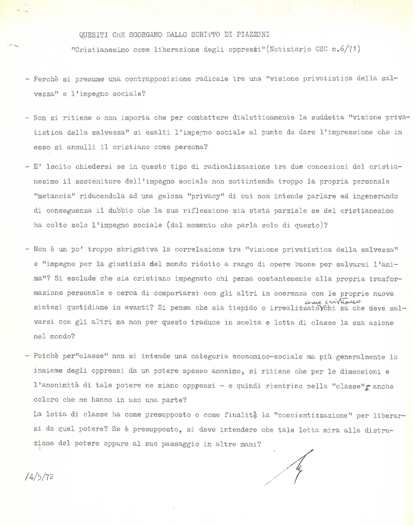 "Quesiti che sgorgano dallo scritto di Piazzoni 'Cristianesimo come liberazione degli oppressi', Notiziario CSC n. 6/71"