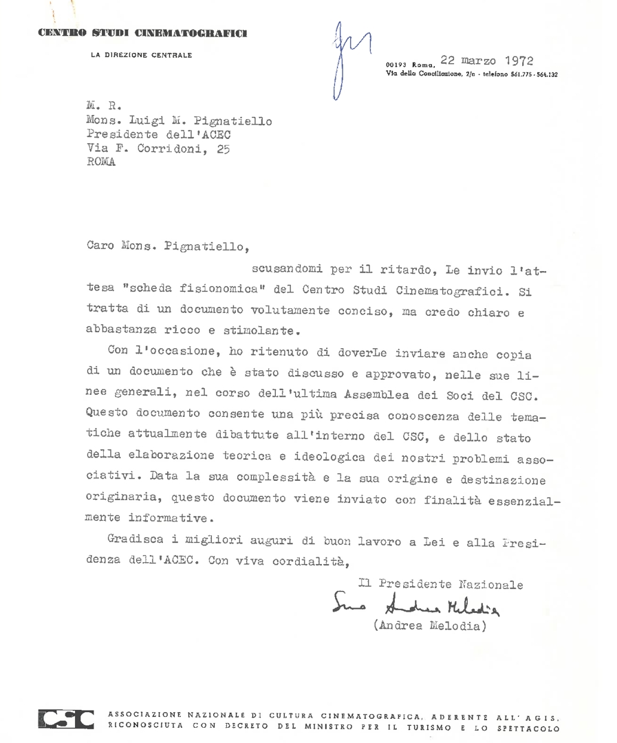 Con lettera di trasmissione di Andrea Melodia, presidente nazionale del Centro, a mons. Luigi Pignatiello, presidente dell'ACEC. Dattiloscritto