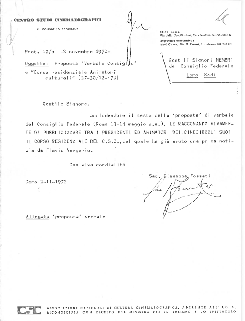 Con lettera di trasmissione di don Giuseppe Fossati, presidente del Consiglio federale del Centro studi cinematografici - CSC, ai membri del Consiglio federale. Dattiloscritto