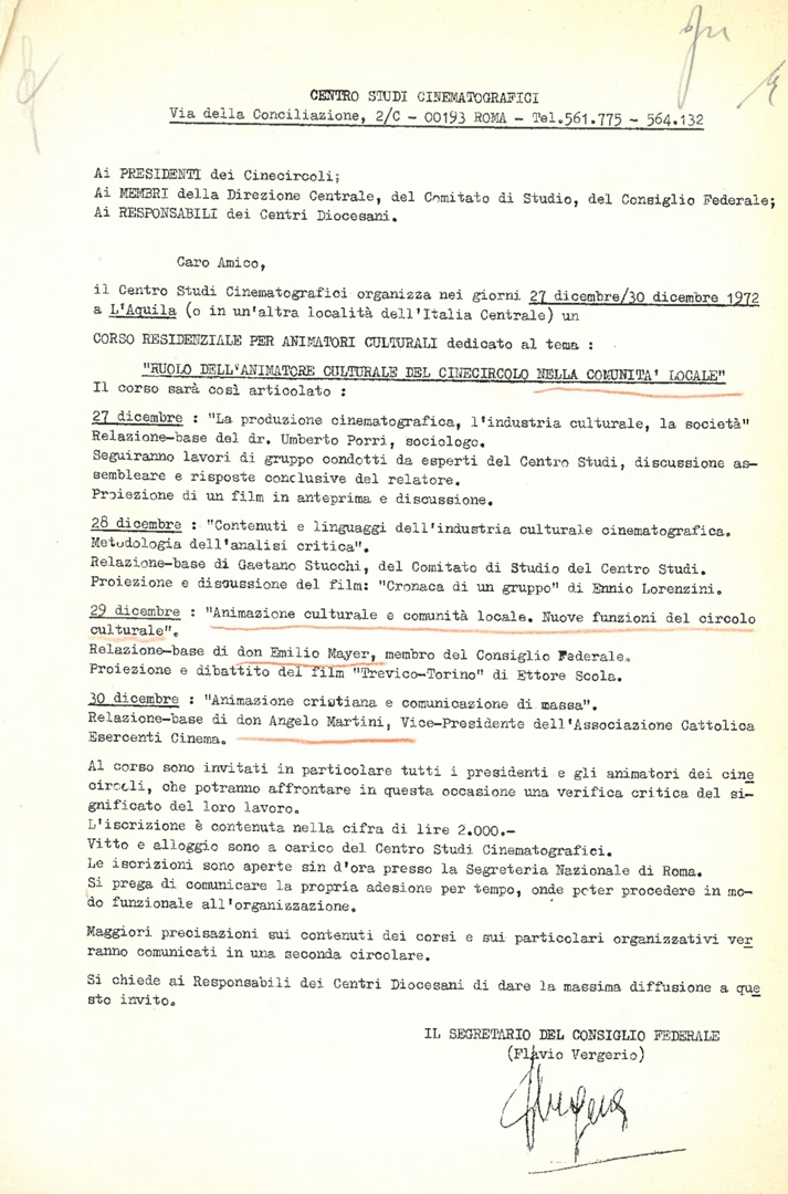 Flavio Vergerio comunica l'organizzazione di un corso per animatori culturali dedicato al tema "Ruolo dell'animatore culturale del cinecircolo nella comunità locale". Dattiloscritto