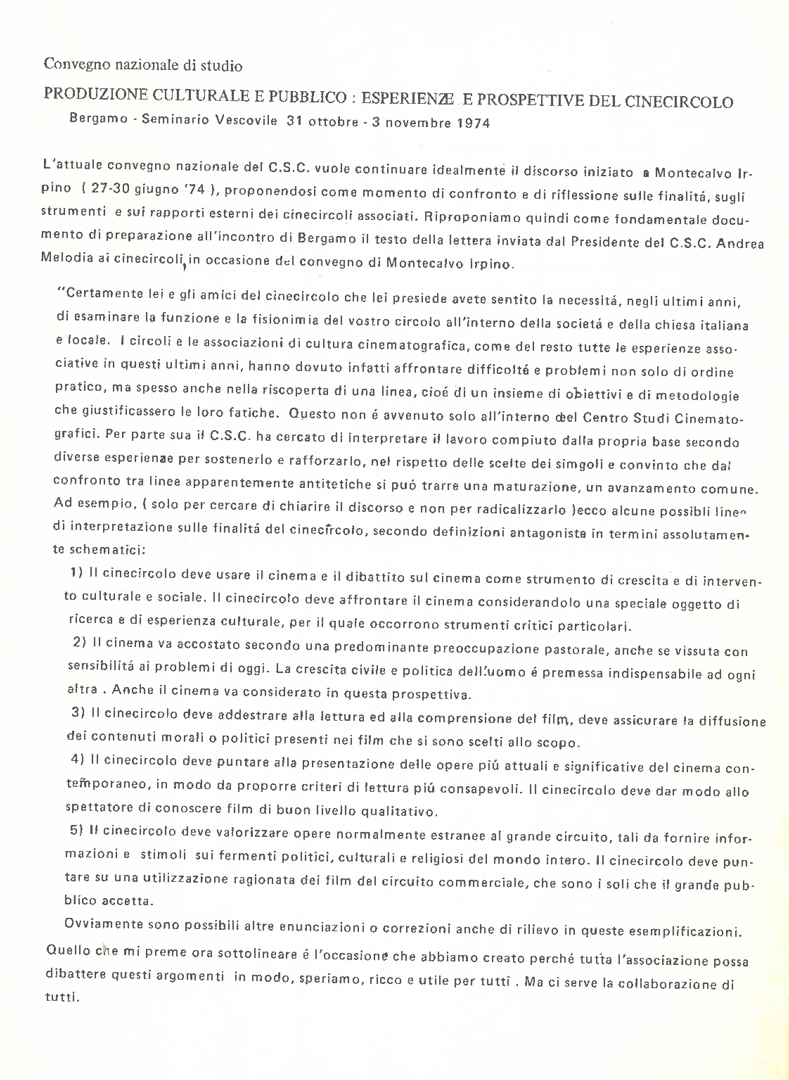 Con testo della lettera inviata da Andrea Melodia, presidente del Centro studi cinematografici - CSC, ai cinecircoli in occasione del convegno di Montecalvo Irpino. Dattiloscritto