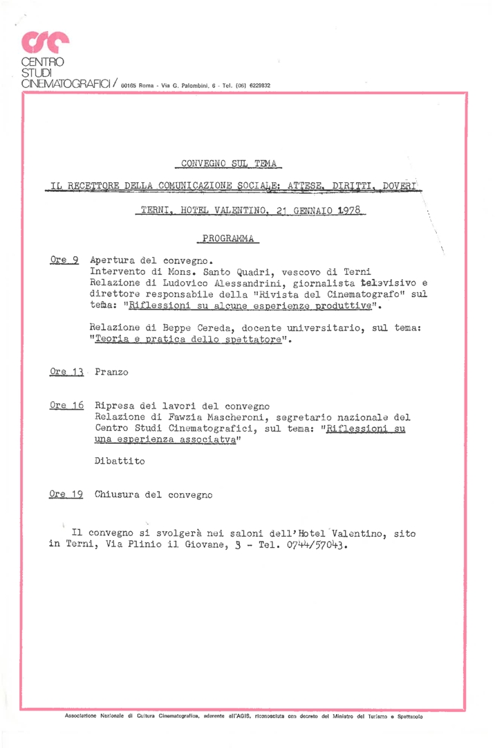 "Convegno sul tema 'Il recettore della comunicazione sociale: attese, diritti, doveri', Terni, 21 gennaio 1978". Programma