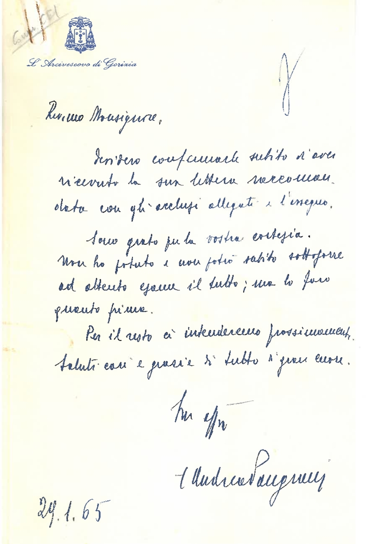 Mons. Andrea Pangrazio conferma a mons. Francesco Dalla Zuanna di aver ricevuto documenti e assegno. Manoscritto
