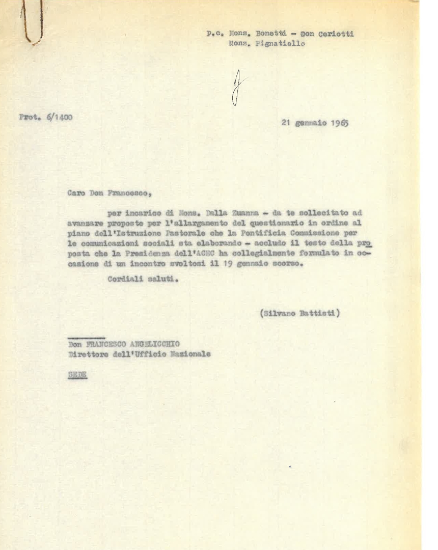 Con lettera di trasmissione di Silvano Battisti, segretario generale dell'ACEC, a don Francesco Angelicchio, direttore dell'Ufficio nazionale. Dattiloscritto