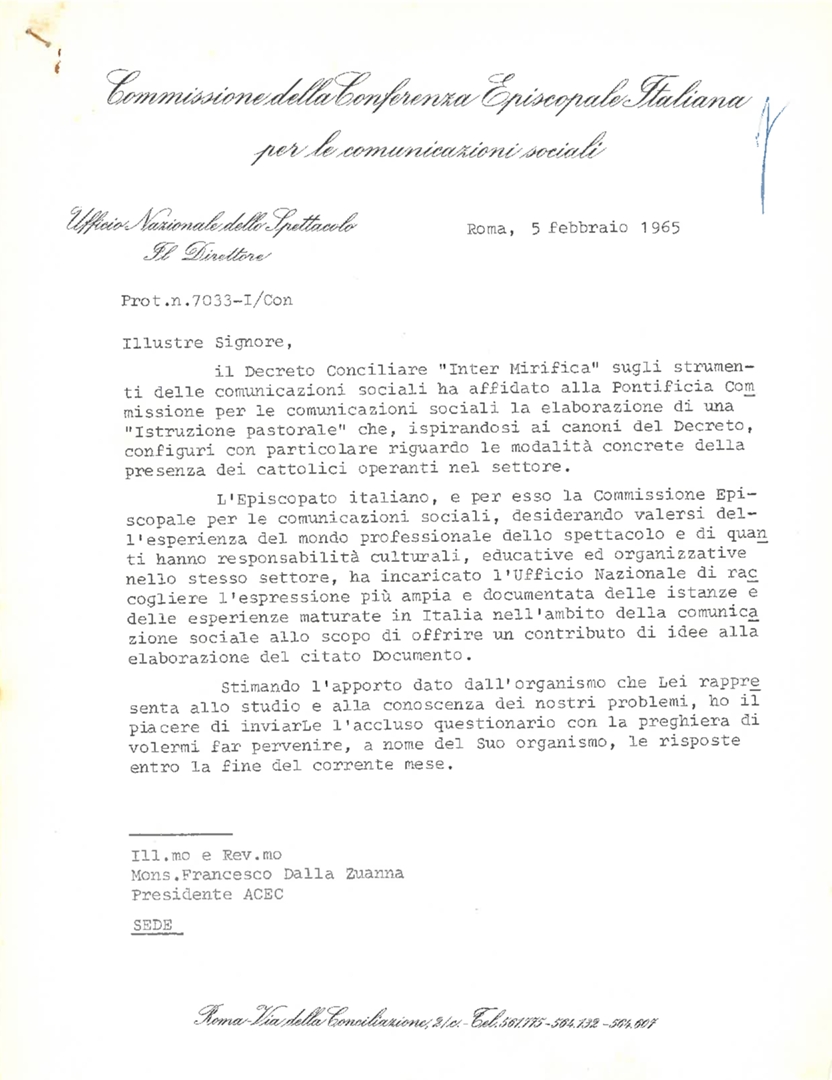 Con lettera di trasmissione di mons. Francesco Angelicchio, direttore dell'Ufficio nazionale dello spettacolo, a mons. Francesco Dalla Zuanna, presidente dell'ACEC. Dattiloscritto