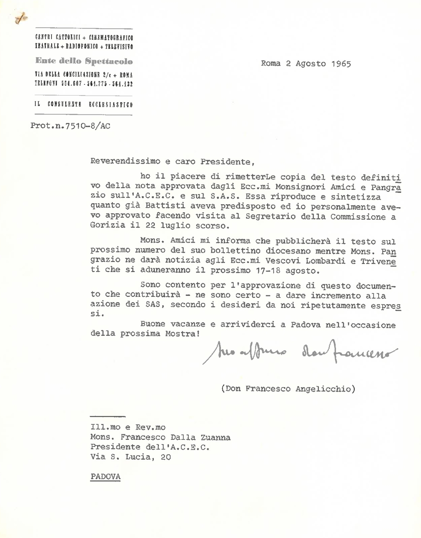 Con lettera di trasmissione di don Francesco Angelicchio, consulente ecclesiastico dell'Ente dello spettacolo, a mons. Francesco Dalla Zuanna, presidente dell'ACEC. Dattiloscritto