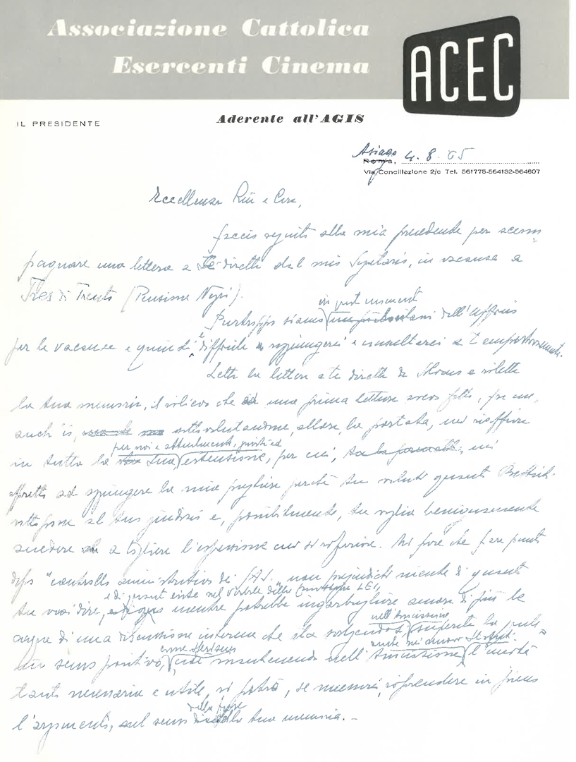 Lettera di don Francesco Angelicchio, consulente ecclesiastico dell'Ente dello spettacolo, a Silvano Battisti, segretario generale dell'ACEC
