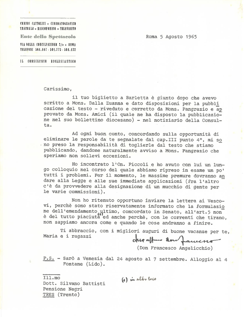 Lettera di don Francesco Angelicchio, consulente ecclesiastico dell'Ente dello spettacolo, a mons. Andrea Pangrazio, segretario della Commissione episcopale per le comunicazioni sociali, arcivescovo di Gorizia e Gradisca