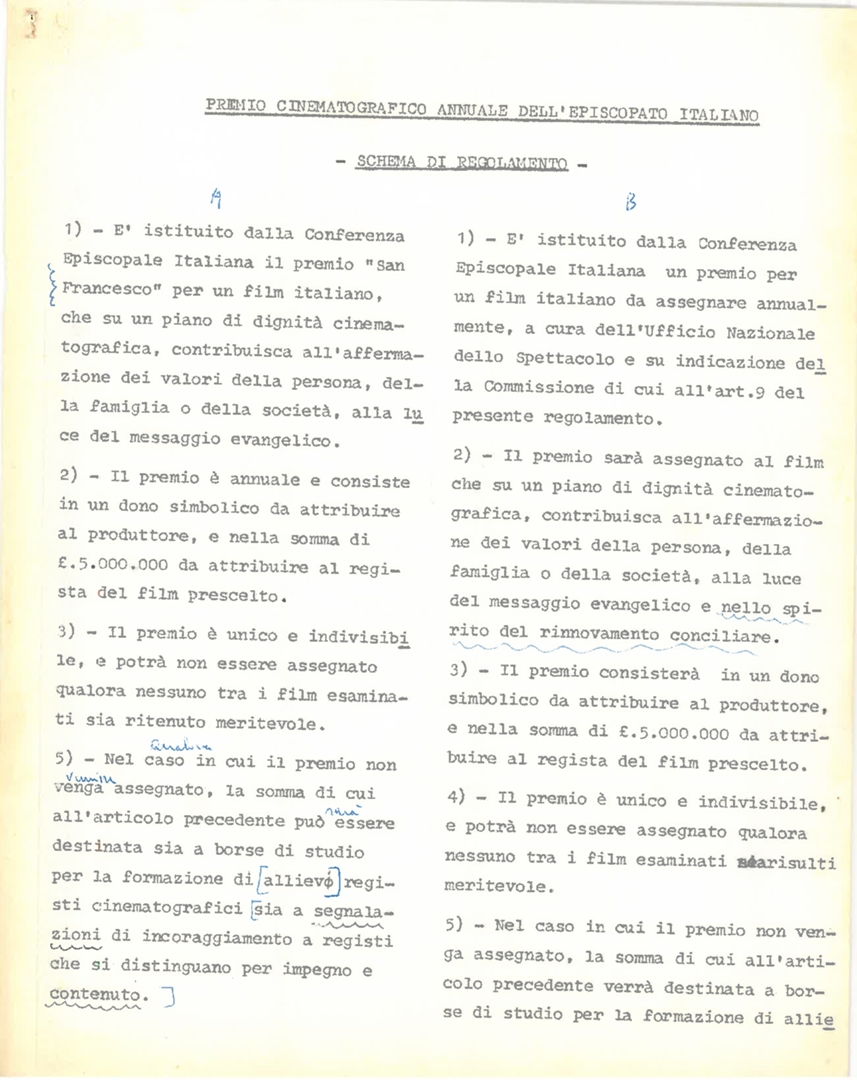 "Premio cinematografico annuale dell'episcopato italiano. Schema di regolamento"