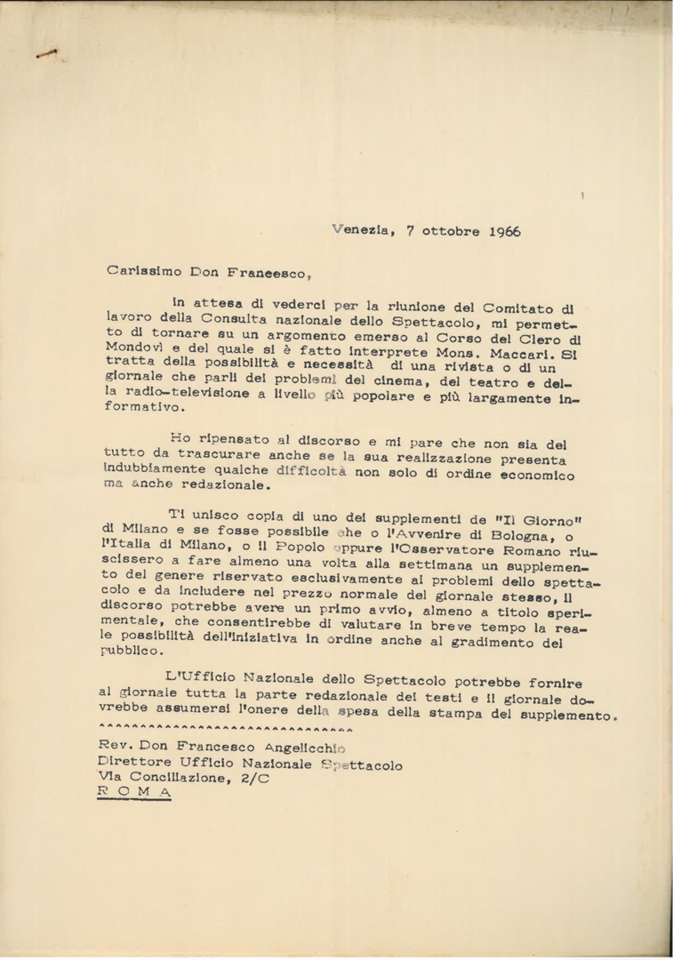 Floris Luigi Ammannati scrive a don Francesco Angelicchio sull'ipotesi della pubblicazione di un periodico dedicato ai problemi del cinema, del teatro e della radio-televisione. Dattiloscritto